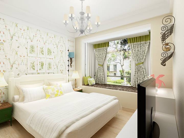 主卧进门后设计衣帽间,满足日常需求,背景墙用密度板设计造型后贴田园风格墙纸,与飘窗窗帘相呼
