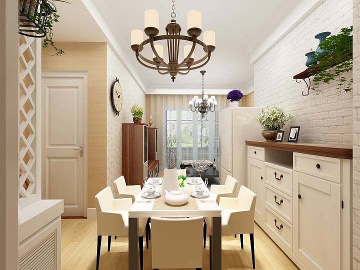 客厅电视背景墙装饰碎花壁纸,其余墙面贴纯色壁纸,简约中增加田园风格,餐厅设计储物柜,柜后墙