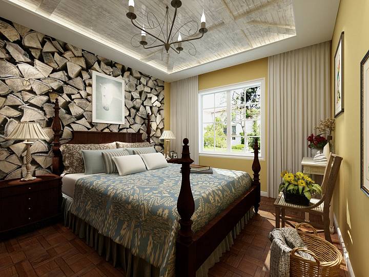 主卧墙面选择暖黄色调,床头背景则选择木质纹路壁纸,搭配清新装饰画,空间典雅。