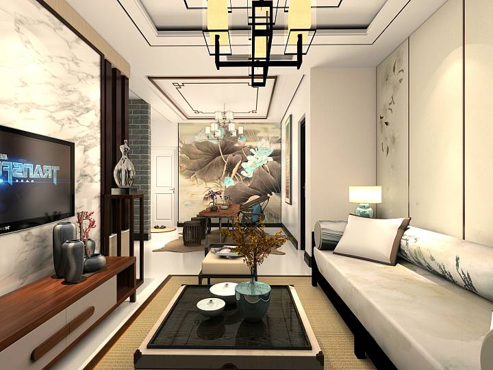 中式吊顶,颇具禅意的床头装饰,造型花艺,个性沙发椅,为卧室增添无限情趣,也与整体中式格调丝