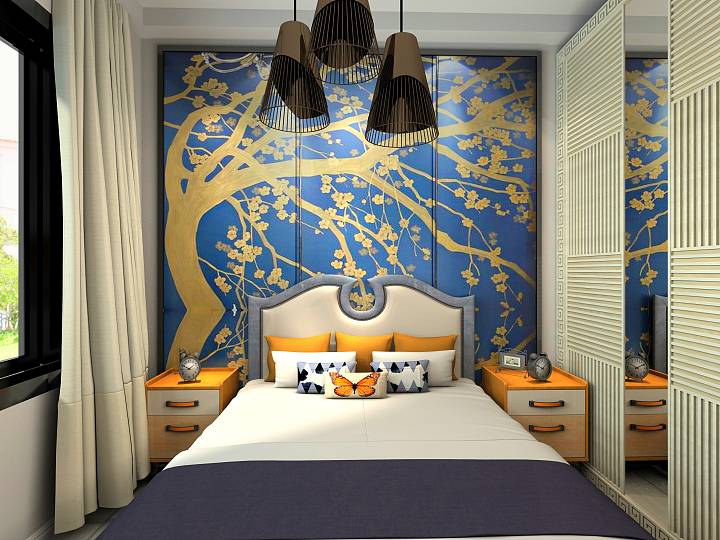 偏日式的樱花背景墙,颜色富丽高雅,床头柜的明橙色与抱枕更为空间添了分彩。床头仿若浪花相击