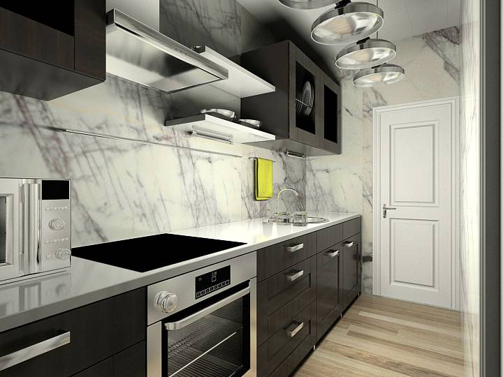 沉稳黑白灰厨房,一字型动线适合小厨房,大理石台面和立面方便清洁。