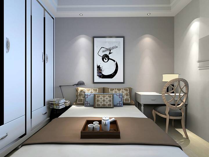 主卧延误客厅整体端庄的风格,床头靠枕和飘窗靠枕颜色呼应。