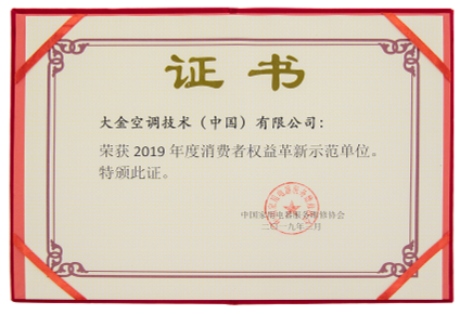大金空调荣获2019年度“消费者权益革新示范单位”和“315消费者家电服务满意诚信企业”双项殊荣