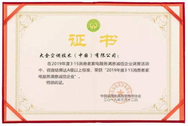 日前,大金空调以迅速对应保障售后服务需求、完善的服务体系、过硬的产品品质赢得广大消费者的认可和青睐,荣获中国家用电器服务协会授予的2019年度“315消费者家电服务满意诚信企业”和“消费者权益革新示范单位”双项殊荣。