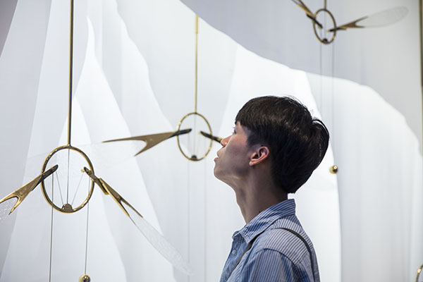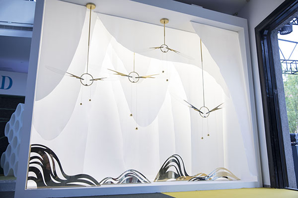 场馆内最醒目的装置,莫过于大金空调联合设计师罗黛诗与谭志鹏打造的“云间 Air Home”。设计师通过铜管的艺术变化,展现微风拂过的树梢、流动斑驳的光影、掠过水面的蜻蜓这些自然界的美好瞬间,创造出一个正在呼吸的时空。展现纯净的空气,传递自然的感受。