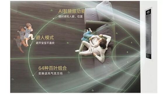 大金3D气流风管式Air Mirror黑奢型空调,可检测人体体表温度、温度、人数,四翼3D横纵百叶在3~5秒内即可做出风向调整,根据运动时动作变化及时调整,实现避开人体。