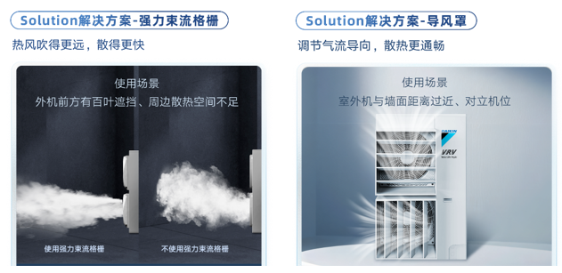 外机散热异常,大金有多种应对的解决方案。比如室外机前方有百叶遮挡、周边散热空间不足时,可以更换强力束流格栅,让热风吹得更远、散得更快;室外机与墙面距离过近、对立机位时,使用导风罩,调节气流导向,让散热更通畅;大金还研发出多款室外机仿生风扇叶片,根据不同机型匹配更适合的风扇,提升风量的同时还可以实现降噪。