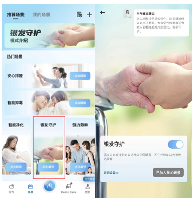 家中长辈岁数渐长,皮肤对冷热的感知开始钝化,这也使得很多老人会在室温偏高或偏低的时候未能察觉,引发身体不适。考虑到老年人的特殊情况,大金金制空气APP里可以设置银发守护模式,在检测温度过高或过低时,自动开启空调进行调温。大金售后向陈先生介绍,即使平时不在老人身边,也能远程开启银发模式,为父母提供贴心守护。