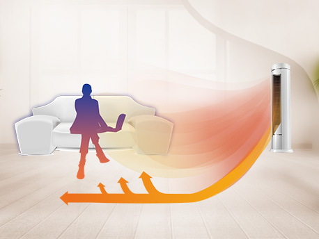 空调制热时,暖流贴着地面走,配合智能式旋转带来的大角度送风,让暖流快速覆盖整个房间,舒适暖风无处不在。