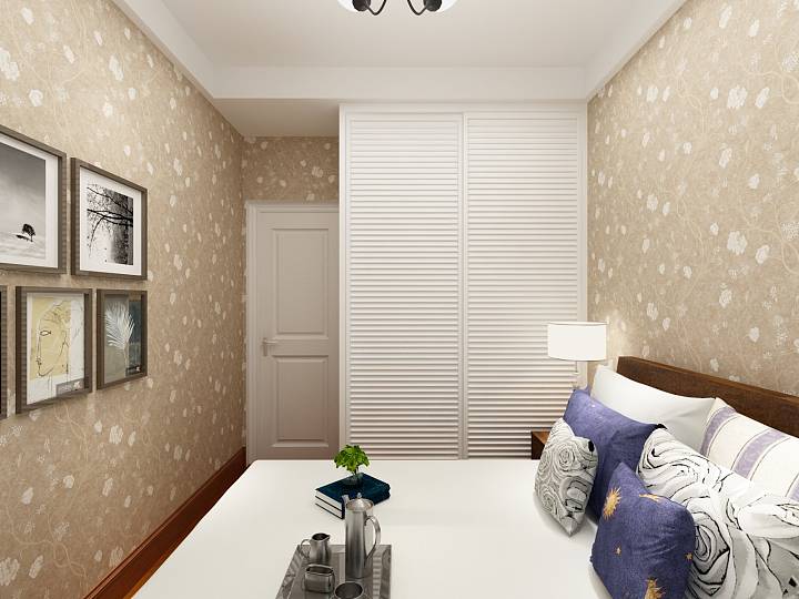 次卧设计典雅柔美,照片墙增添艺术气息,衣柜的百叶移门设计为房间增添田园元素。