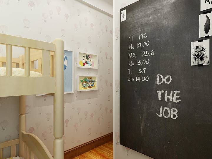 儿童房采用上下床的设计,墙上装饰小黑板,满足孩子的绘画欲望,激发孩子的想象力。
