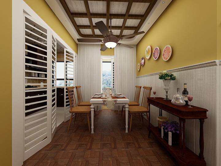 客餐厅选择了橙色和黄色为基调,家具则选择深色做旧实木家具,咖啡色和红色皮质沙发与墨绿色布艺