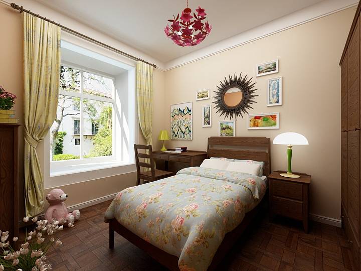 次卧则选择深浅橙色调,搭配实木家具,给小女儿营造活泼的空间。女儿爱好音乐,喜欢拉小提琴,墙