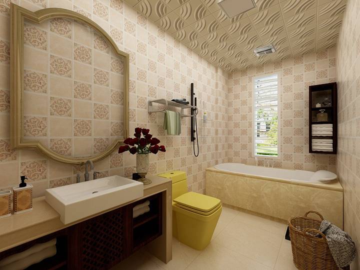 卫生间较大,设计了浴缸和淋浴区,黄色的马桶给空间注入了活力。