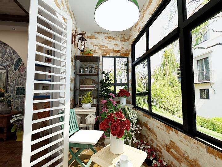 南向阳台,作为业主家的小花园,斑驳做旧的墙面,各种绿植鲜花和桌椅小凳,打造一个小花园。