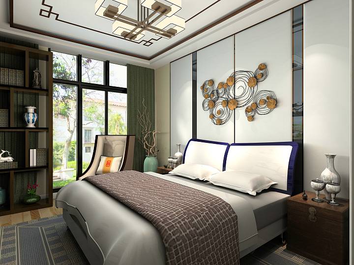 中式吊顶,颇具禅意的床头装饰,造型花艺,个性沙发椅,为卧室增添无限情趣,也与整体中式格调丝